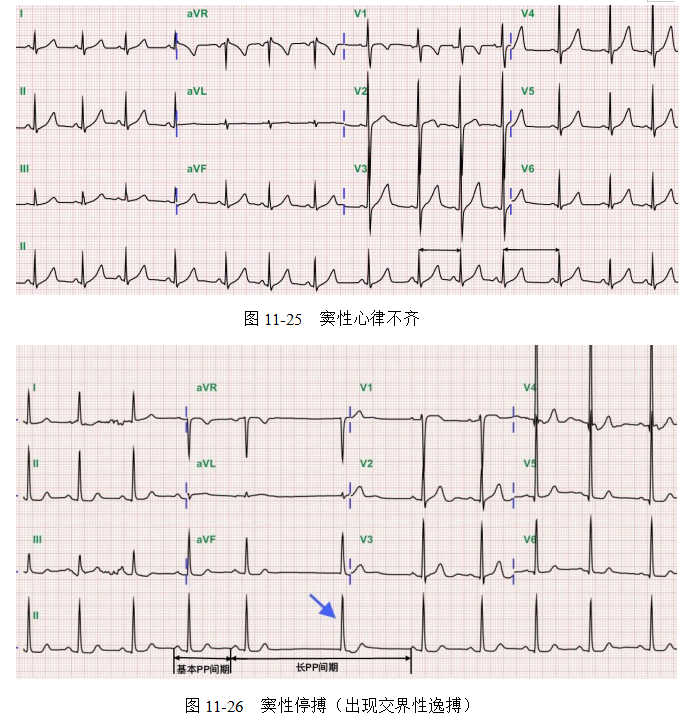 4.窦性心律不齐(sinusarrhythmia)是指窦性心律的起源未变,但节律不整,在同一导联上PP间期差异>0.12秒。窦性心律不齐常与窦性心动过缓同时存在(图11-25)。较常见的一类心律不齐与呼吸周期有关,称呼吸性窦性心律不齐,多见于青少年,一般无临床意义。另有一些比较少见的窦性心律不齐与呼吸无关,例如与心室收缩排血有关的(室相性)窦性心律不齐以及窦房结内游走性心律不齐等。