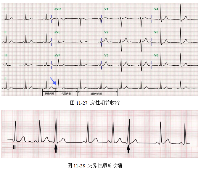 2.房性期前收缩(prematureatrialcontraction)心电图表现为:①期前出现的异位P'波,其形态与窦性P波不同;②P'R间期>0.12秒;③大多为不完全性代偿间歇,即期前收缩前后两个窦性P波的间距小于正常PP间距的两倍。