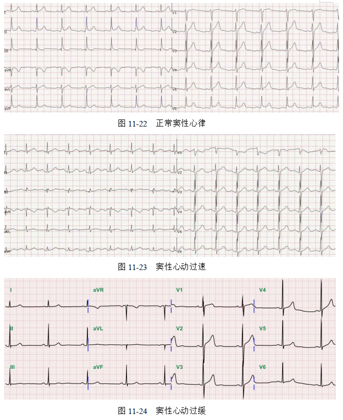 3.窦性心动过缓(sinusbradycardia)传统上规定窦性心律的频率<60次/分时,称为窦性心动过缓(图11-24)。近年大样本健康人群调查发现:约15%正常人静息心率可<60次/分,尤其是男性。另外,老年人及运动员心率可以相对较缓。窦房结功能障碍、甲状腺功能减退、服用某些药物(例如β-受体阻滞剂)等亦可引起窦性心动过缓。