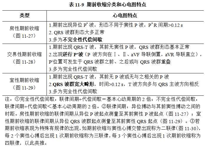 3.交界性期前收缩(prematurejunctionalcontraction)心电图表现为:①期前出现的QRS-T波,其前无窦性P波,QRS-T形态与窦性下传者基本相同;②出现逆行P'波(P波在Ⅱ、Ⅲ、aVF导联倒置,aVR导联直立),可发生于QRS波群之前(P'R间期<0.12秒)或QRS波群之后(RP'间期<0.20秒),或者与QRS相重叠;③大多为完全性代偿间歇。