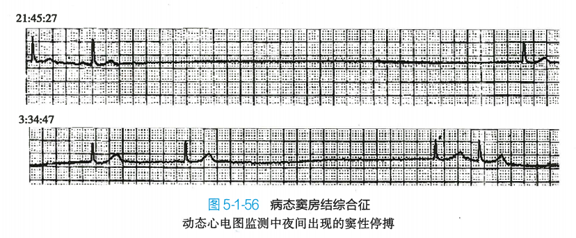 6.病态窦房结综合征(sicksinussyndrome,SSS)近年发现,起搏传导系统退行性病变以及冠心病、心肌炎(尤其是病毒性心肌炎)、心肌病等疾病,可累及窦房结及其周围组织而产生一系列缓慢性心律失常,并引起头昏、黑矇、晕厥等临床表现,称为病态窦房结综合征。其主要的心电图表现有:①持续的窦性心动过缓,心率<50次/分,且不易用阿托品等药物纠正;②窦性停搏或窦房阻滞;③在显著窦性心动过缓基础上,常出现室上性快速心律失常(房速、房扑、房颤等),又称为慢-快综合征;④若病变同时累及房室交界区,可出现房室传导障碍,或发生窦性停搏时,长时间不出现交界性逸搏,此即称为双结病变。