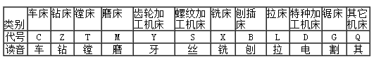 机床的组别和系别代号用两位数字表示。每类机床按其结构性能及使用范围划分为10个组,用数字0-9表示。每组机床又分若干个系(系列)。系的划分原则是:主参数相同,并按一定公比排列,工件和刀具本身的及相对运动特点基本相同,且基本结构及分布型式相同的机床,即划为同一系。机床的类、组划分参见国标JB1838-85。