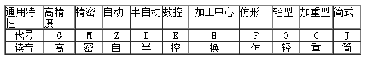 机床的特性代码表示机床所具有的某些通用特性和结构特性。当某类型的机床除了普通型外,还具有如表2-3所示的某种通用特性,则在类别代号之后加上相应的特殊代号,例如“CK”表示数控车床。若同时具有两种通用特性,在可以同时用两个代码示之,例如“MBG”表示半自动高精度磨床。