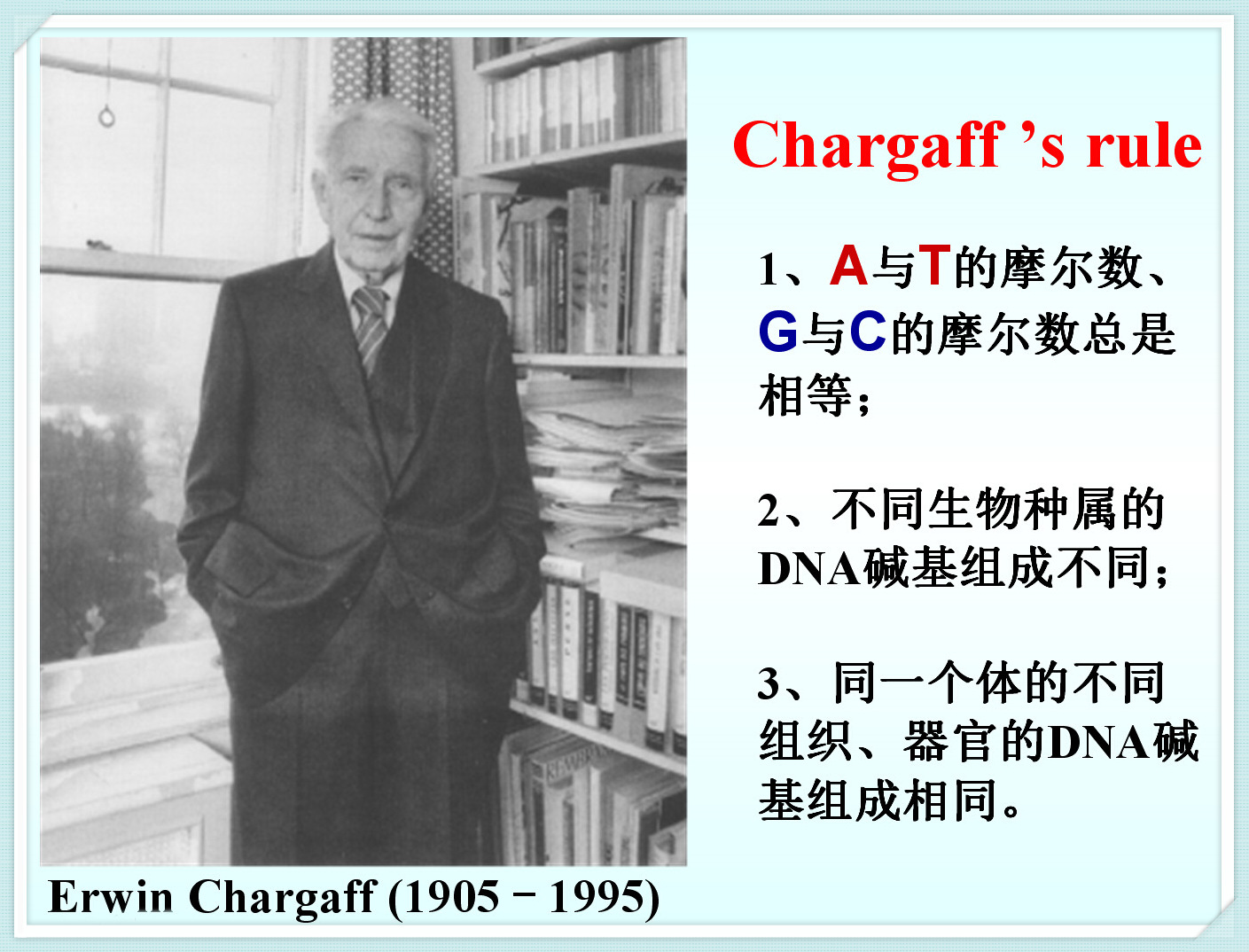 b. DNA的碱基组成具有种的特异性,即不同生物的DNA皆有自己独特的碱基组成。