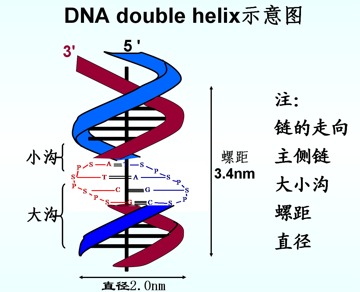 a.两条反平行的多核苷酸链绕同一中心轴相缠绕,形成右手双股螺旋,一条5’→3’,另一条3’→5’