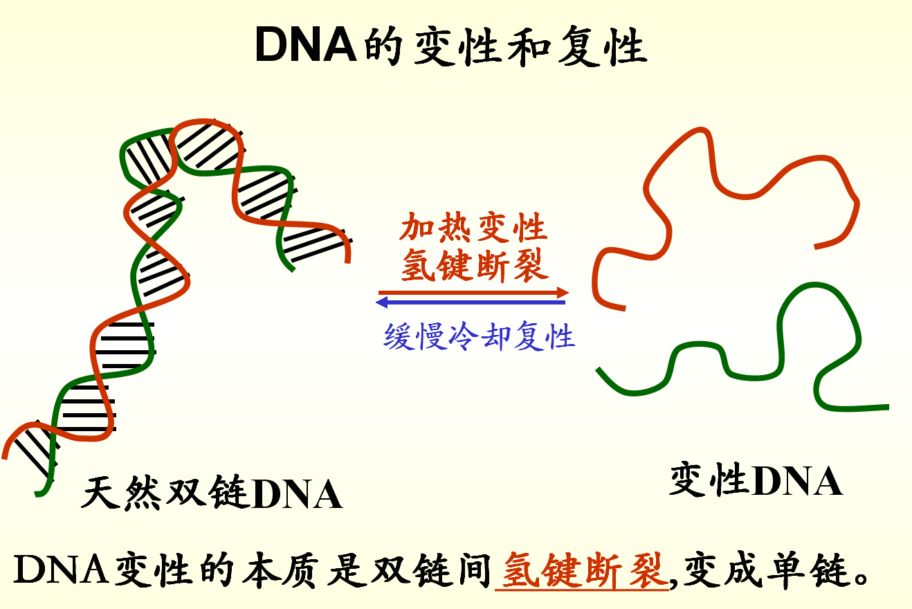 变性DNA在缓慢冷却时(快速冷却可防止复性),可以复性。DNA片段越大,复性越慢;DNA浓度越大,复性越快。