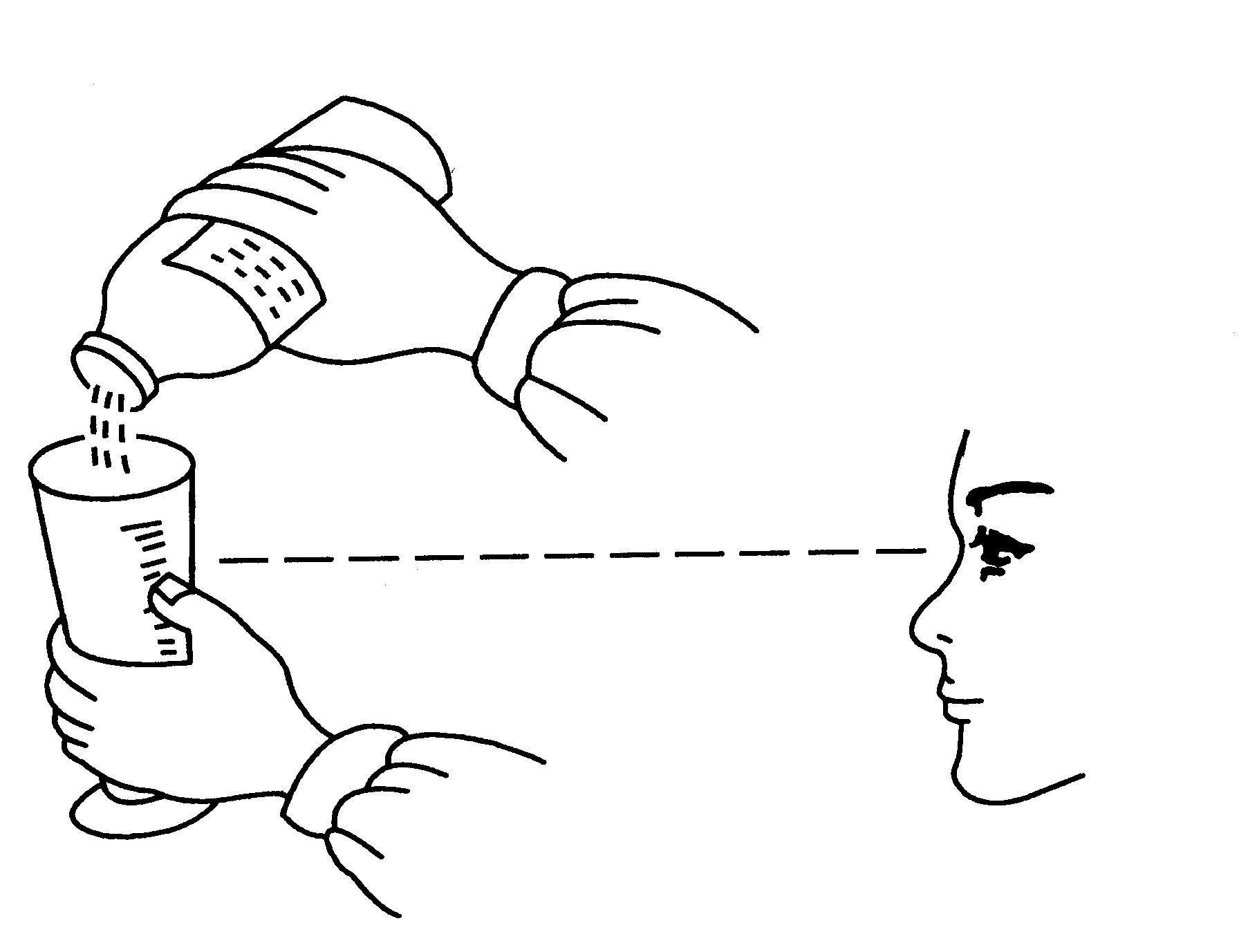 1.取药 固体药用药匙 取;水剂用量杯(将药液摇匀,左手持量杯,拇指置于所需刻度与视线平行;右手持药瓶,将标签朝手心,缓慢倒入所需量,倒毕以湿纱布擦净瓶口,将药液倒入药杯)。同时服用几种药液时,应分别倒入不同药杯。如更换药液品种应洗净量杯;药液不足1 ml用滴管,1ml按15滴计算;油剂或按滴计算的药液应先在杯中加入少量的冷开水,以免药液附着在杯上,影响服下的剂量;个人专用药单独存放,防止差错。