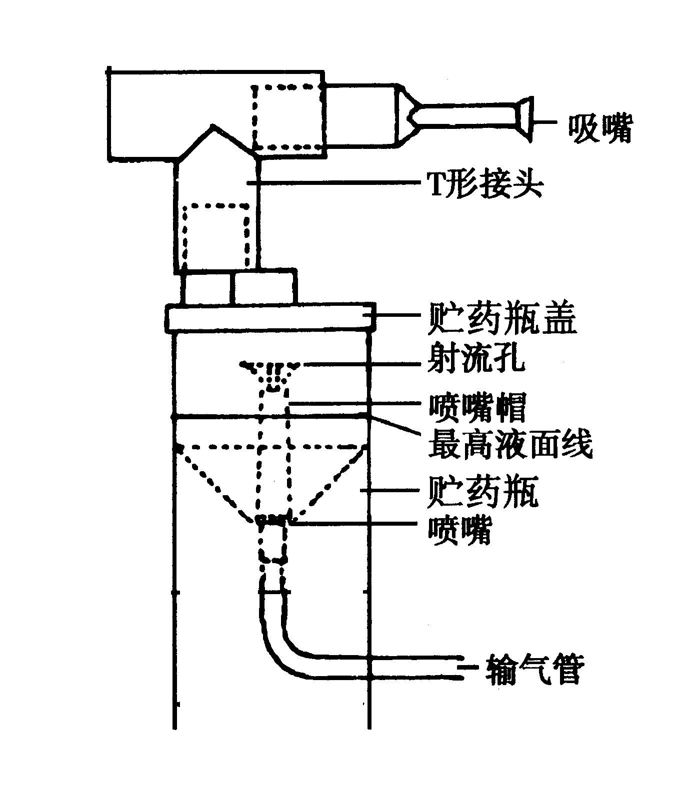 (1)氧气雾化吸入器 常用的氧气雾化吸入器为射流式雾化器,当高速氧气气流通过毛细管时,在管口产生负压,将药液自邻近小管吸出同时被毛细管口高速的气流撞击,形成细小的雾滴,并随气流喷出。
