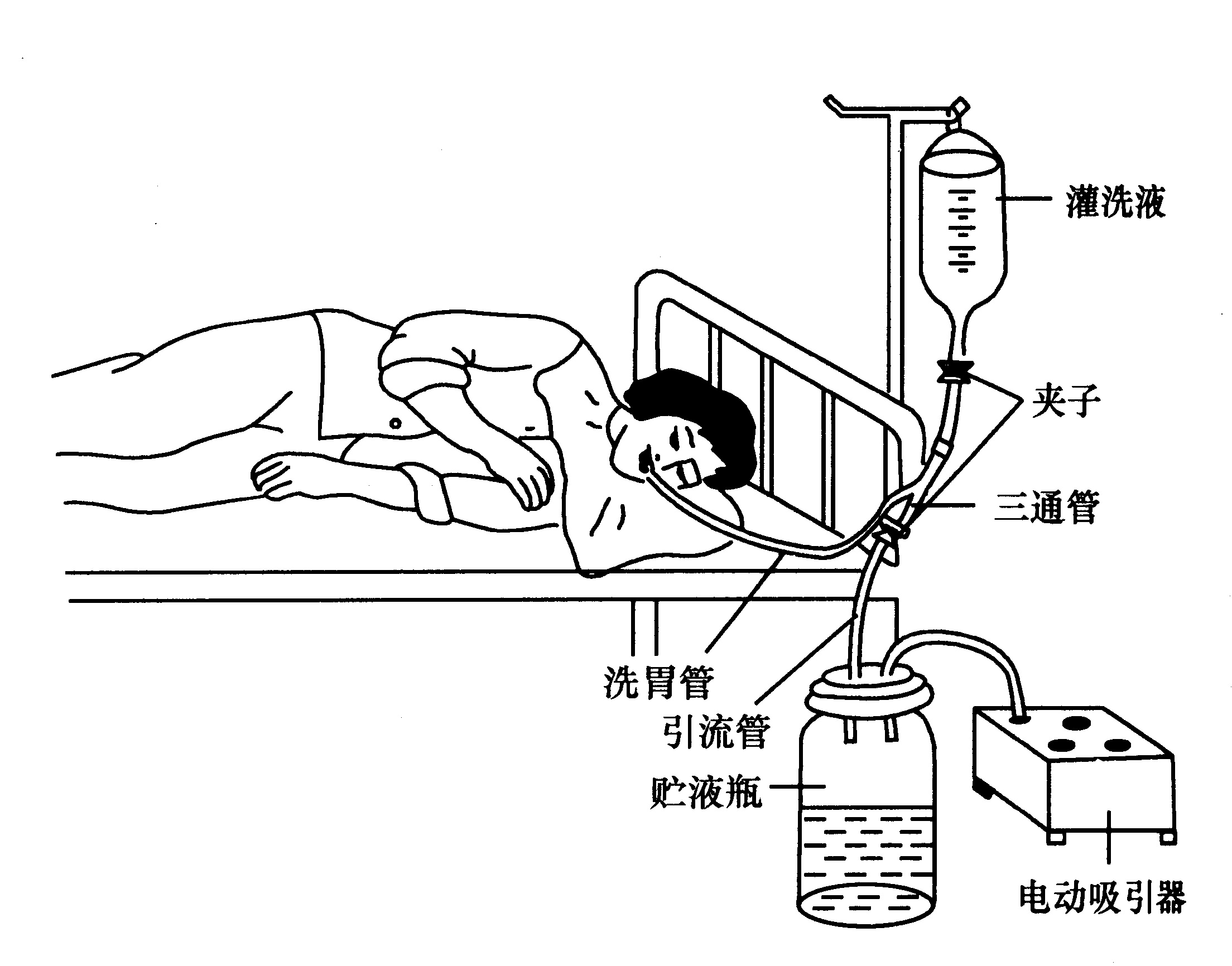 3.根据毒物性质选用洗胃液。当毒性物质不明时,洗胃溶液可选用温开水或生理盐水。
