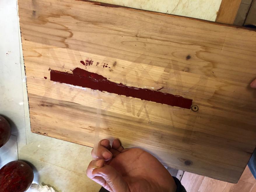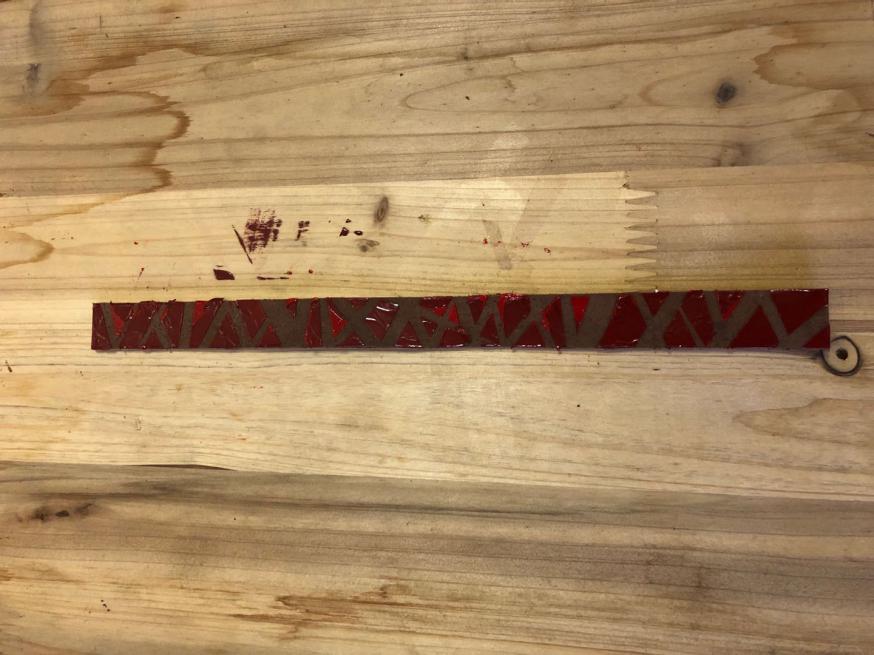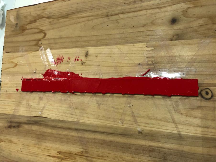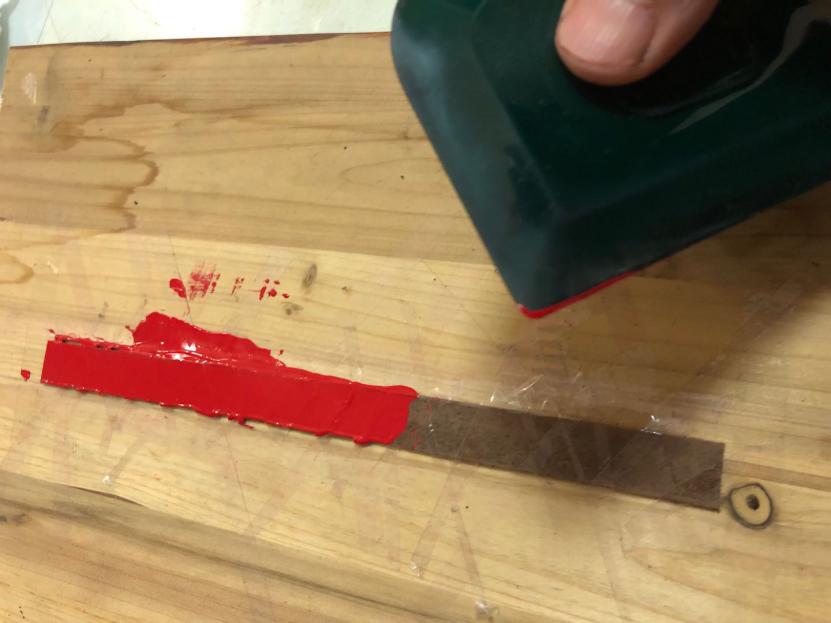 3用橡胶刮刀把红色漆刮在胶带固定好的皮胎上。