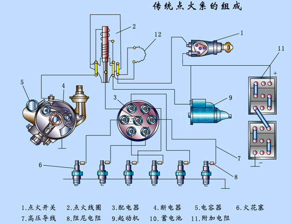 电源(蓄电池和发电机)、点火开关、点火线圈、分电器(断电器、配电器、电容器以及点火提前机构)、高压线、火花塞等