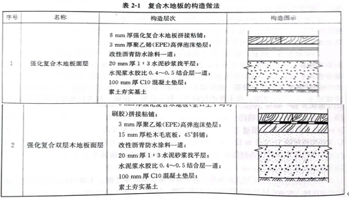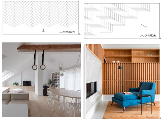 课程思政:中国木地板行业的发展过程大致经历了以下三个阶段: 一、80年代初至90年代初。最初的10年,市场上的木地种类主要为不上漆的实木地板块(俗称素板),这个时期的地板块规格较小,平接地板较多。 二、90年代初至1994年。这个时期市场上出现了带漆的企口实木地板,有滚漆、淋漆两种工艺;小规格的地板逐渐减少,占市场主导地位的为中长规格地板;另外,市场上的木地板种类丰富了很多,出现了竹材地板、三层实木复合地板和多层实木复合地板。 三、1994年至今。1994年,浸渍纸层压木质地板(俗称强化木地板)进入中国市场,开始以进口产品为主,主要从欧洲进口,以德国企业的产品居多;1996年,中国开始自行生产强化木地板;最近几年,市场上又出现了指接地板、集成材地板和竹材复合地板、石塑地板等新产品,其中竹材复合地板和石塑地板处于起步阶段还未形成批量生产,其它产品均呈逐渐增长趋势。 课堂讨论:木地板有哪些常见的铺装方式? 工字拼是一种比较常规的木地板铺设方式,这种铺设手法能够满足大多数的设计效果。铺设时,木地板的长边应该与投射进空间的光线方向平行。可以分为二分之一拼法、三六九拼法和45°斜铺的做法。 如果觉得工字拼的效果比较单调,可以选择人字拼的铺设方式,这种铺设方式虽然视觉效果比较丰富,但是施工难度相对较大,需要考虑到收口等问题。 鱼骨拼在形态上和人字拼类似,但是它的造型其实就是按照鱼骨头的形状进行瓶贴,效果相对来说也更加简洁。 田字铺贴法就是将几块同样长度的长方形木板拼接成正方形,然后横竖更替,做成一个田字格的造型。  任务三、复合木地板装饰施工 复合木地板是用原木经粉碎、添加胶黏剂、防腐处理、高温高压制成的中密度板材,表面刷涂高级涂料,在经过切割、刨槽刻榫等加工制成拼块复合木地板。地板规格比较统安装极为方便,是国内目前比较广泛应用的地板装饰材料,在国外已有20多年的应用历史。 1.基本构造 复合木地板的构造做法见表21 2.材料质量要求 目前,在市场上销售的复合木地板无论是国产或进口产品,其规格都是统一的,宽度为120m、150mm和195mm:长度为150mm和2000mm;厚度为6mm、8mm和14mm:所用的胶黏剂有白乳胶、强力胶、立时得等。 复合地板的品种如下 (1)以中密度板为基材,表面贴天然薄木片(如红木、橡木、桦木、水曲柳等),并在其表面涂结晶三氧化二铝耐磨涂料 (2)以中密度板为基材,底部贴硬质PVC薄板作为防水层,以增强防水性能,在其表面涂结晶三氧化二铝耐磨涂料 (3)表面为胶合板,中间设塑料保温材料或木屑,底层为硬质PVC塑料板,经高压加工制成地板材料,表面涂耐磨涂料。 上述三种板材按标准规格尺寸裁切,经过刨槽、刻后制成地板块,每10块为一捆,包装出厂销售。 3.施工工艺流程 复合木地板铺贴和普通企口缝木地板铺设基本相同,只是其精度更高一些。复合木地板的施工工艺流程为:基层处理→弹线、找平→一铺垫层→试铺预排→铺地板→铺踢脚板→清洗表面 4.施工要点 (1)基层处理。复合木地板的基层处理与前面相同,要求平整度3m内误差不得大于2mm,基层应当干燥。铺贴复合木地板的基层一般有:楼面钢筋混凝土基层、水泥砂浆基层、木地板基层等,不符合要求的要进行修补。木地板基层要求毛板下木龙骨间距要密一些,一般情况下不得大于300mm. (2)铺设垫层。复合木地板的垫层为聚乙烯泡沫塑料薄膜,其宽度为1000mm卷材,铺设时按房间长度净尺寸加100mm裁切,横向搭接150m。垫层可增加地板隔潮作用,增加地板的弹性并增加地板稳定性,减少行走时地板产生的噪声。 (3)试铺预排。在正式铺贴复合木地板前,应进行试铺预排。板的长缝隙应顺人射光方向沿墙铺放,槽口对墙,从左至右,两板端头企口插接,直到第一排最后一块板,切下的部分若大于300mm,可以作为第二排的第一块板铺放,第一排最后一块的长度不应小于500mm,否则可将第一排第一块板切去一部分,以保证最后的长度要求。木地板与墙体间应留出8-10mm缝隙,用木楔进行调直,暂不涂胶。拼铺三排进行修整、检查平整度符合要求后,按排编号拆下放好。 (4)铺木地板。按照预排的地板顺序,对缝涂胶拼接,用木槌敲击挤紧。复验平直度,横向用紧固卡带将三排地板卡紧,每隔1500m左右设置一道卡帯,卡带两端有挂钩,卡带可调节长短和松紧度。从第四排起,每拼铺一排卡带移位一次,直至最后一排。每排最后一块地板端部与墙体间仍留8~10mm缝隙。在门的洞口,地板铺至洞口外墙皮与走廊地板平接。如果为不同材料,留出5mm缝隙,用卡口的盖缝条进行盖缝。 (5)清扫擦洗。每铺贴完一个房间并等待胶干燥后,对地板表面进行认真清理,扫净杂物、清除胶痕,并用湿布擦净。 (6)安装踢脚板。复合木地板可选用仿木塑料踢脚板、普通木踢脚板和复合木地板。在安装踢脚板时,先按踢脚板的高度弹出水平线,清理地板与墙缝隙中杂物,标出预埋木砖的位置,按木砖位置在踢脚板上钻孔,孔径应比木螺钉直径小1~1.2mm,用木螺钉进行固定。踢脚板的接头尽量设在不明显的地方。