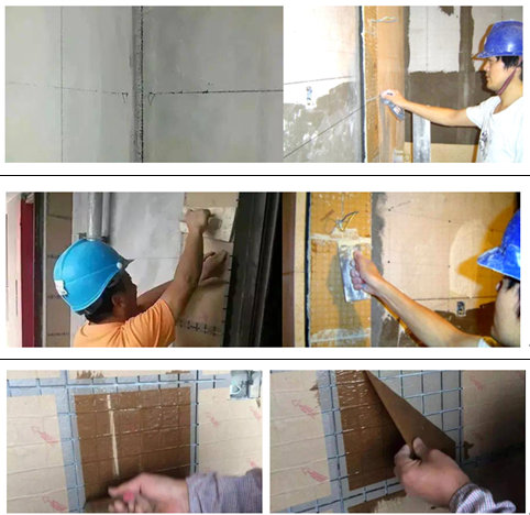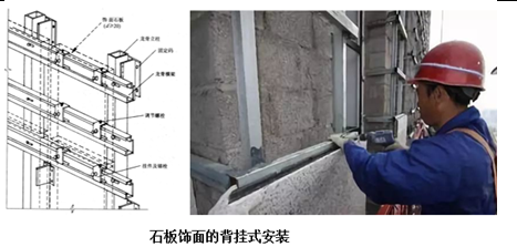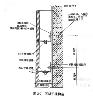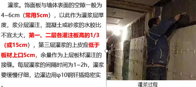 课前 1.发布课前要求 要求同学熟练掌握陶瓷马赛克与石材饰面工程施工技术基础知识,掌握陶瓷马赛克与石材饰面材料与施工工艺。 要求:作业本,铅笔、橡皮、直尺等绘图工具。 2.组织教学内容,提出能力目标 知识目标: (1)了解主要机具的使用方法; (2)了解主要材料; (3)掌握陶瓷马赛克与石材饰面工程施工工艺; (4)掌握施工注意事项。 能力目标: (1)能熟练的选用施工机具和应用的主要材料; (2)能掌握陶瓷马赛克与石材饰面工程施工技术,并能正确指导现场施工。 (3)能了解并掌握陶瓷马赛克与石材饰面工程施工注意事项。 学习重点:陶瓷马赛克与石材饰面工程施工步骤 学习难点:陶瓷马赛克与石材饰面施工工艺 课中 软件签到 通过APP,引出学习重点 内墙饰面主要起着保护墙体、改善室内使用条件和美化室内环境等作用。 软件投票 题目:贴面类饰面工程按所在部位不同,可以分为哪两部分?( )多选(3分钟) A外墙饰面工程B. 内墙饰面工程C. 装饰饰面工程D. 一般饰面工程 通过课件,讲授新课知识 软件讨论 陶瓷马赛克是陶质还是瓷质? 陶瓷马赛克的成品按不同图案贴在纸上用它拼成的图案形似织锦,其原材料为优质瓷土。 任务一、陶瓷马赛克镶贴施工 1.基本构造 陶瓷马赛克的成品按不同图案贴在纸上用它拼成的图案形似织锦,其原材料为优质瓷土。陶瓷马赛克饰面基本构造如图3-5所示。 2.材料质量要求 (1)陶瓷马赛克。陶瓷马赛克有挂釉和不挂釉两种,质地坚硬,色泽多样。为保证接缝平直,镶贴前要逐张对其尺寸、颜色、完整性进行挑选。 (2)水泥。使用42.5级或42.5级以上的普通硅酸盐水泥,存放时间超过使用期限的水泥不能使用。当采用白色或浅色陶瓷马赛克时,应采用白水泥。 (3)砂。粗砂或中砂,含泥量少于3%,使用前应过筛。 (4)石灰膏。使用前一个月将生石灰焖淋,经过3mm孔径筛,石灰膏内部不应含未熟化的颗粒及杂质。  3.施工工艺流程 陶瓷马赛克镶贴方法有软贴法、硬贴法和干缝洒灰湿润法三种。其中,软贴法施工工艺流程为:基层处理→抹底子灰→排砖→弹线分格→镶贴→揭纸→调缝→擦缝→清洗→喷水养护;千缝洒灰湿润法施工操作程序为:在铺贴时,在马赛克纸背面满洒1:1细砂水泥干灰充满拼缝,然后用灰刀刮平,并洒水使缝内干灰润湿成水泥砂浆,再按软贴法的程序铺贴于墙面。 4.施工要点 (1)基层处理。基层处理方法及要求同瓷砖镶贴施工。 (2)抹底子灰。底子灰一般为二次操作,第一次抹薄一层,用抹子压实。第二次用相同配合比砂浆按冲筋抹平,用短刮杠刮平低凹处填平补齐,最后用木抹子搓出麻面,然后根据气温情况,终凝后浇水养护。 (3)排砖。依照建筑物横竖装饰线、门窗洞、窗台、挑梁、腰线等凹凸部分进行全面安排。排砖时特别注意外墙、墙角、墙垛、雨篷面及天沟槽、窗台等部位构造的处理与细部尺寸,精确计算排砖模数并绘制镶贴马赛克排砖大样(也称排版大样)作为弹线依据。 (4)弹线分格。根据设计、建筑物墙面总高度、门窗洞口和陶瓷马赛克品种规格定出分格缝宽,弹出若干水平线同时加工分格条。注意同一墙面不得有一排以上的非整砖。 (5)镶贴。先应找好标准,一般两间连通的房间应由门口中间拉线,以此为标准,然后从里向外退着铺,也可以从门口开始,人站在垫木板上往里铺。有镶边的房间,应先铺镶边部分。贴砖一般为三个人同时操作。一人在前面洒水湿润墙面,随即抹出黏结层;另一人将马赛克铺在木托盘上,麻面(粘贴面)朝上,在马赛克缝隙内灌注1:1的水泥细石灰浆,再抹上一层薄灰浆;然后递给第三个人,将四边灰浆刮掉,按上述方法与要求贴砖,并随手刮去马赛克边缘缝隙渗出的灰浆。 (6)揭纸。一般一个单元的陶瓷马赛克铺完后,在砂浆初凝前(为20~30min),陶瓷马赛克达到基本稳固时,用清水喷湿护面纸,用双手轻轻将纸揭下,揭纸的用力方向应尽量与墙面平行。 (7)调缝。镶贴马赛克揭纸后,如果发现“跳块”或“瞎缝”,应及时用开刀拨开复位。调缝方法是用手将开刀置于要调缝中,逐条按要求慢慢将缝调直、调匀;拨好后压上木拍板并用小木槌轻敲、拍板、压实,使马赛克黏结牢固。 (8)擦缝。黏结层的水泥浆完成终凝而具有强度后,用水泥浆满刮马赛克表面,将马赛克间的缝隙抹满、嵌实,不留缝隙。水泥浆刮后即可用棉丝或湿抹布擦拭马赛克表面至干净为止,使马赛克本色清晰显露出来。擦缝的水泥品种可根据马赛克的颜色选定。一般浅色的马赛克使用白水泥即可。 (9)清洗、养护。清洗墙面应在黏结层和勾缝砂浆终凝后进行全面清理并擦干净后,次日喷水养护。  课程思政:《营造法式》规定:石料加工有六道工序: ①打剥──凿掉大的突出部分; ②搏──凿掉小的突出部分; ③细漉[lù] ──基本凿平; ④棱──边棱凿整齐方正; ⑤斫砟[zhuó zhǎ]──用斧錾平; ⑥磨──用水砂磨去斫痕。 任务二、石材贴挂饰面施工 石材贴挂饰面是指用钢筋网、镀锌钢制锚固件将预先制作好的大规格天然石材板块或人造石板块挂贴固定于墙面的饰面工程。石材贴挂饰面的施工方法主要有湿挂法、干挂法等。 (一)基本构造 1.湿挂法构造 湿挂法是指先在建筑基体上固定好石材板后,再在板材饰面的背面与基层表面所形成的空腔内灌注水泥砂浆或水泥石屑浆,将天然石板整体固定牢固的施工方法。石材湿挂的构造做法如图3-6