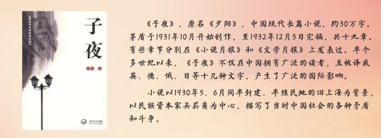 《子夜》,原名《夕阳》,中国现代长篇小说,约30万字。茅盾于1931年10月开始创作,至1932年12月5日完稿,共十九章。1933年1月由上海开明书店出版。先后被译为英、德、俄、日等十几种文字。