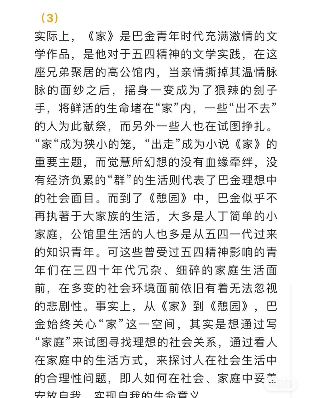 2.《憩园》:巴金在四十年代创作的中篇小说《憩园》可以说是“激流三部曲”的尾声,描写的是一个封建大家庭败落之后的情形。作品以第一人称“我”黎先生作为故事的叙述者,把姚、杨两家的变迁联系起来,交错展示出两种不同类型的封建家庭的衰败的必然性,谴责了旧制度对健康人性的摧残。小说是由众多的生活片断联缀而成,构思精巧、独特,情节发展零散但不杂乱,错落有致。