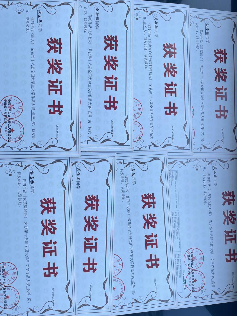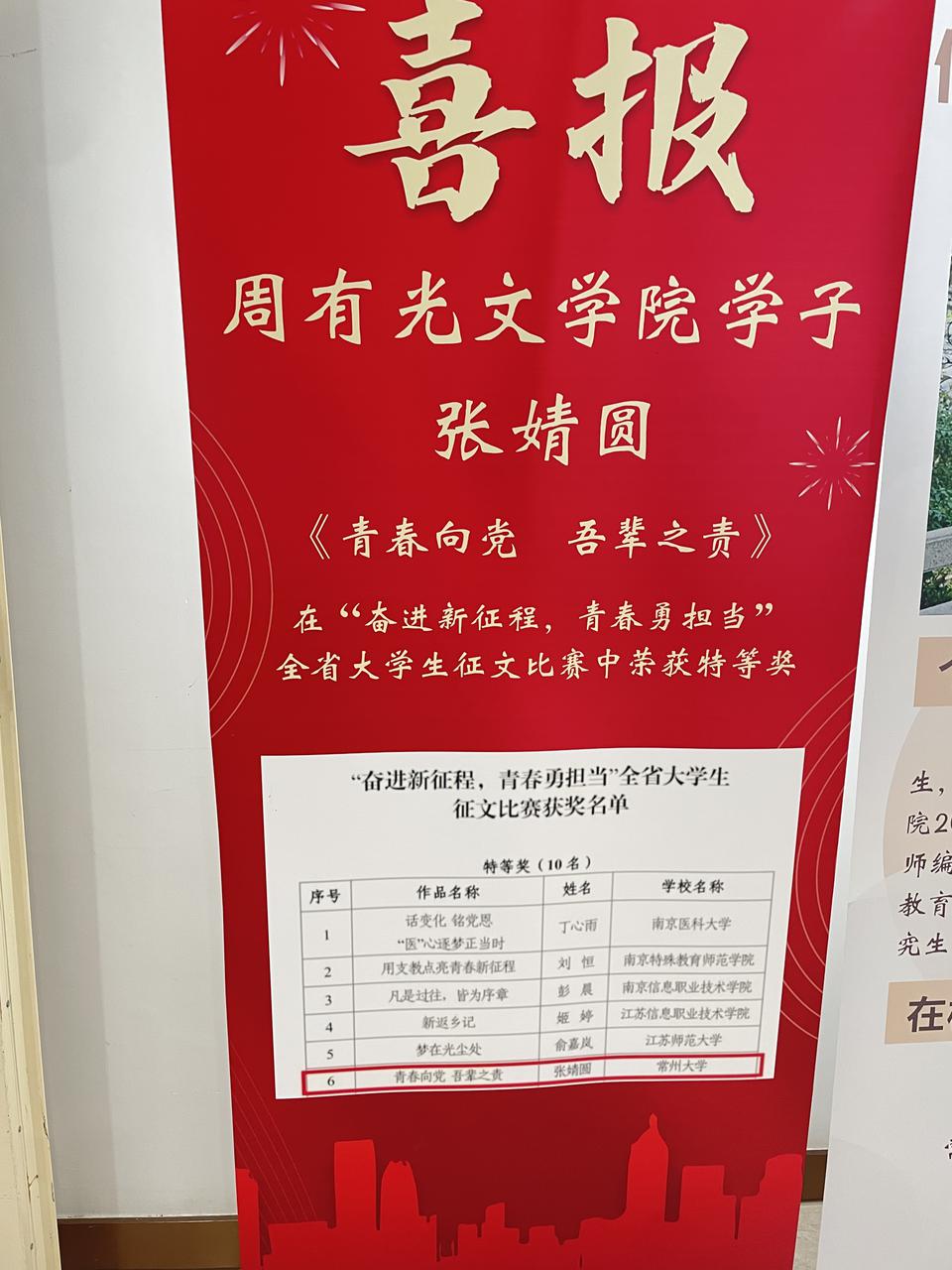 自2020年7月至2024年9月9日,学生先后在在学习强国、上海写作协会、《中国青年作家报》《新华日报》《江苏教育报》《江苏工人报》《江苏经济报》《扬子晚报》《现代快报》《金陵晚报》《常州日报》《常州晚报》《武进日报》《德州晚报》《淮阴报》《高邮日报》《宜春日报》《巴彦淖尔日报》《贺州日报》《北海日报》《泉州晚报》《泰州晚报》《赣西晚报》《散文诗世界》《青春》《翠苑》《演讲与口才》《秘书之友》等报刊等公信力平台,发表作品逾600篇。在德州晚报长河副刊等公信力平台不完全统计发文逾50篇。211张婧圆获得江苏省“奋进新征程,青春勇担当”全省大学生征文及演讲比赛特等奖一项(2022);2022年大广赛省二等奖1项;2023年大广赛省三等奖、优秀奖各1项;2024年大广赛省级二等奖、三等奖各一项;第18届全国学生作文大赛获21项:一等奖2项,二等奖6项,三等奖13项(2023年)。2023年江苏省书评大赛一二三等奖6名。2023年江苏省云诵读大赛优秀作品3项。2023江苏省青少年科幻文学大赛二三优秀奖3项。2023学习强国“温暖我的瞬间”征文,全国二等奖(汉语201任启元)。