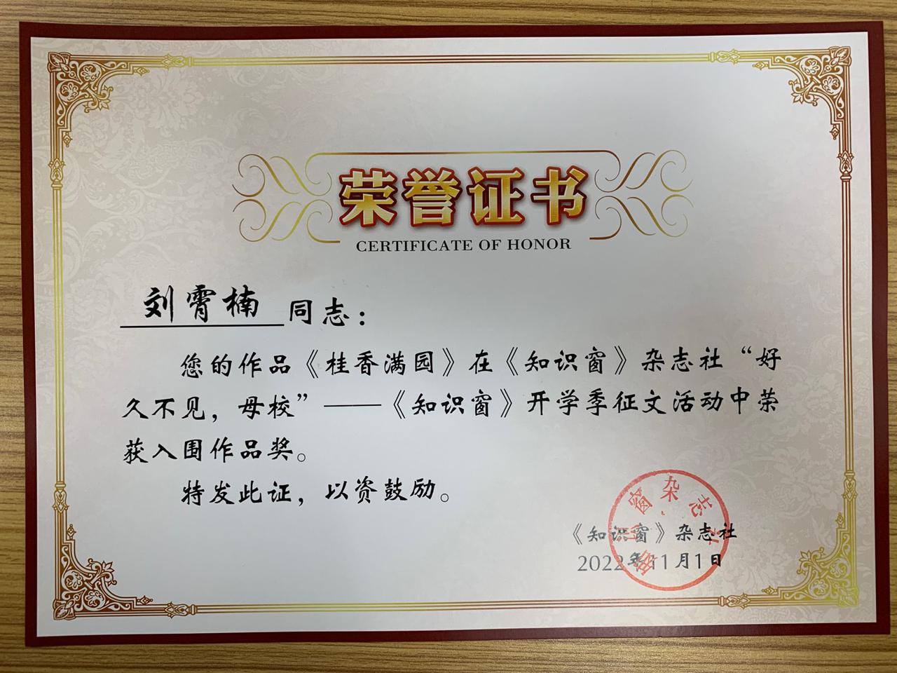 中文202刘霄楠入围了“好久不见,母校”《知识窗》开学季征文活动 ,
