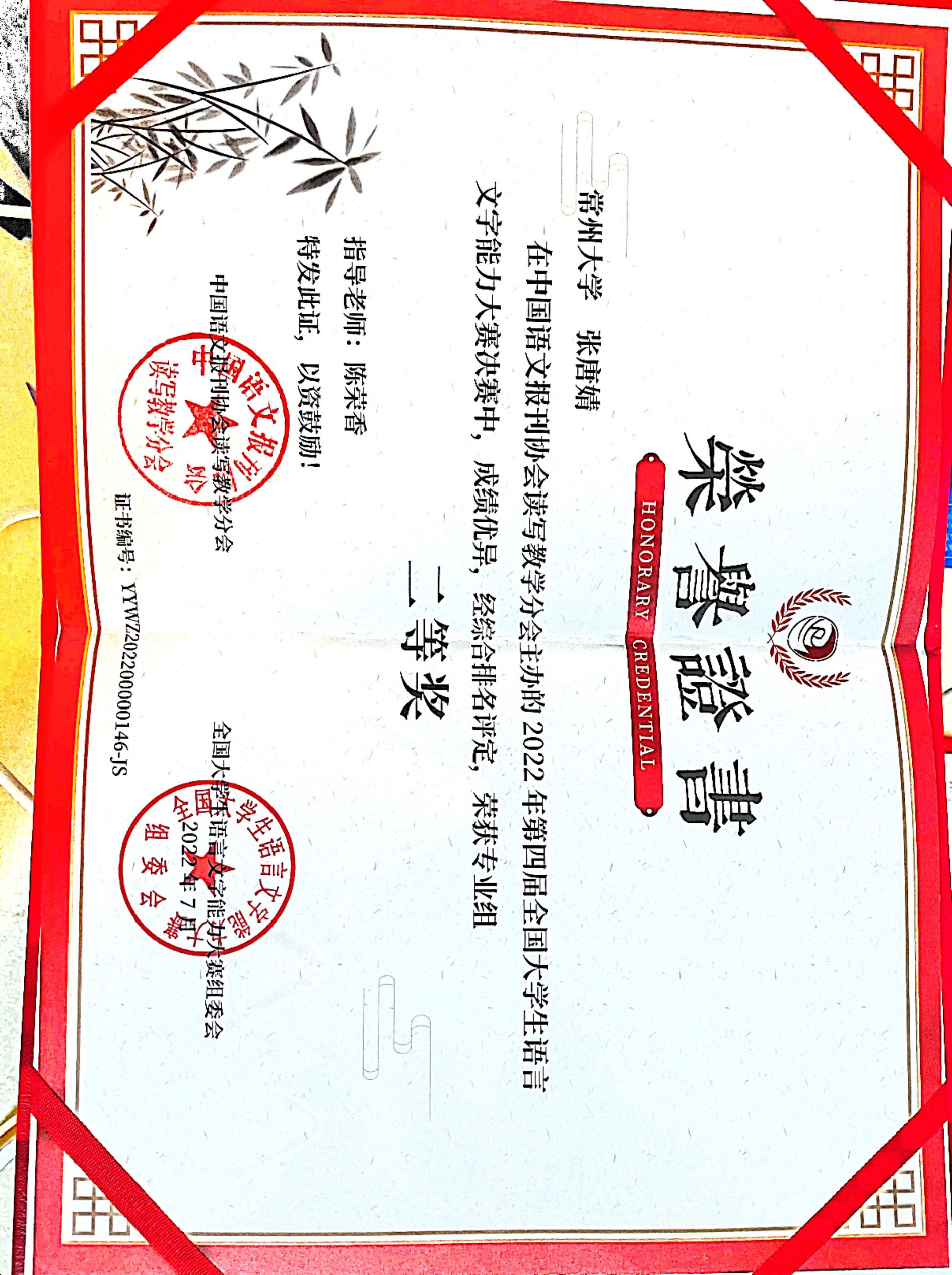 1 | 211张唐婧 | 第四届全国大学生语言文字能力大赛专业组 第二名 | 中国语文报刊协会读写教学分会 第四届全国大学生语言文字能力大赛组委会 |