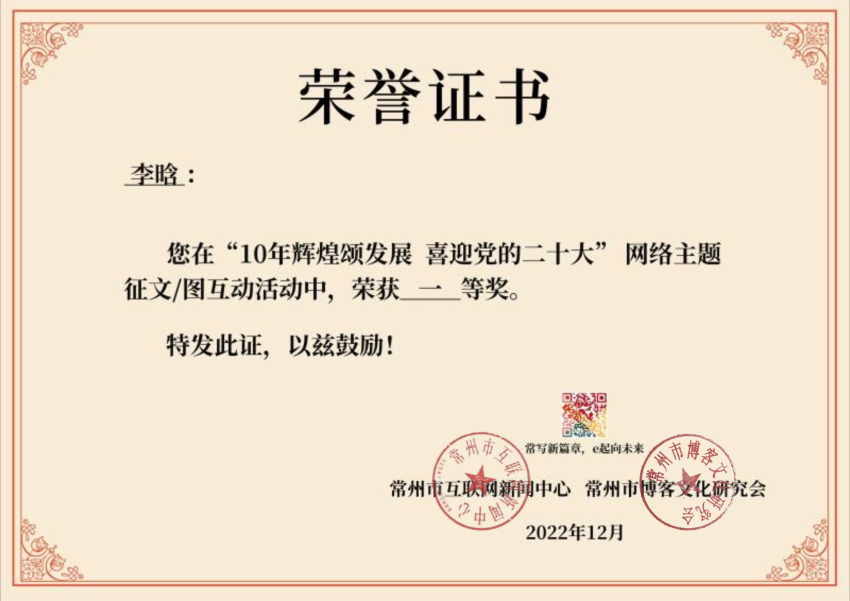 为喜迎、喜庆党的二十大胜利召开,厚植广大市民网友爱党爱国爱家乡的情怀,2022年9月6日—12月6日,中国常州网与常州市博客文化研究会联合举办了“10年辉煌颂发展 喜迎党的二十大”网络主题征文/图互动活动。
