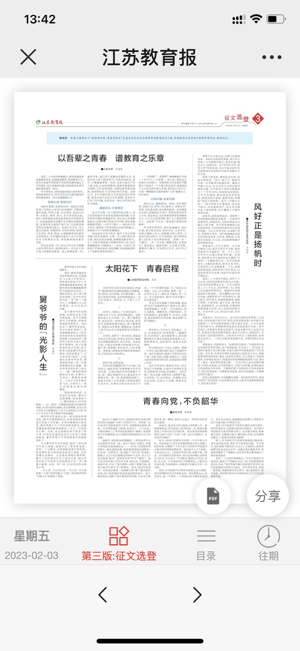 江苏省教育厅关于“奋进新征程,青春勇担当”全省大学生征文比赛特等奖;1