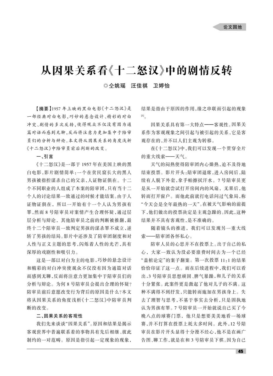 4. 汉语211 仝姚瑶 等 《从因果关系看十二路汉中的剧情反转》,《文学纵横》40期,逻辑学课程论文。