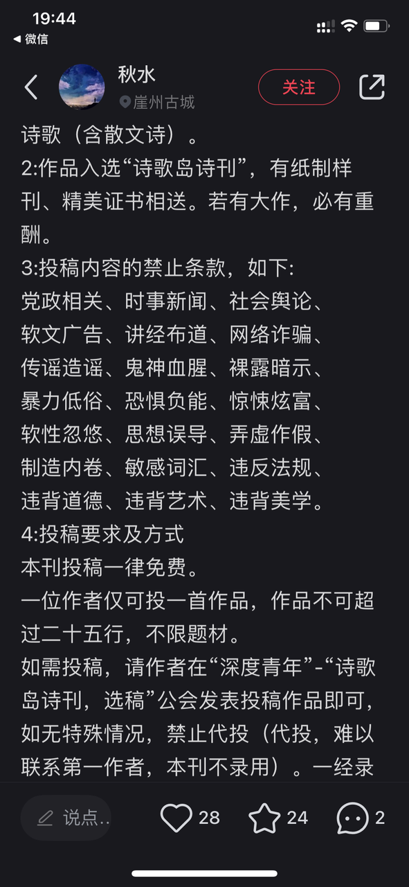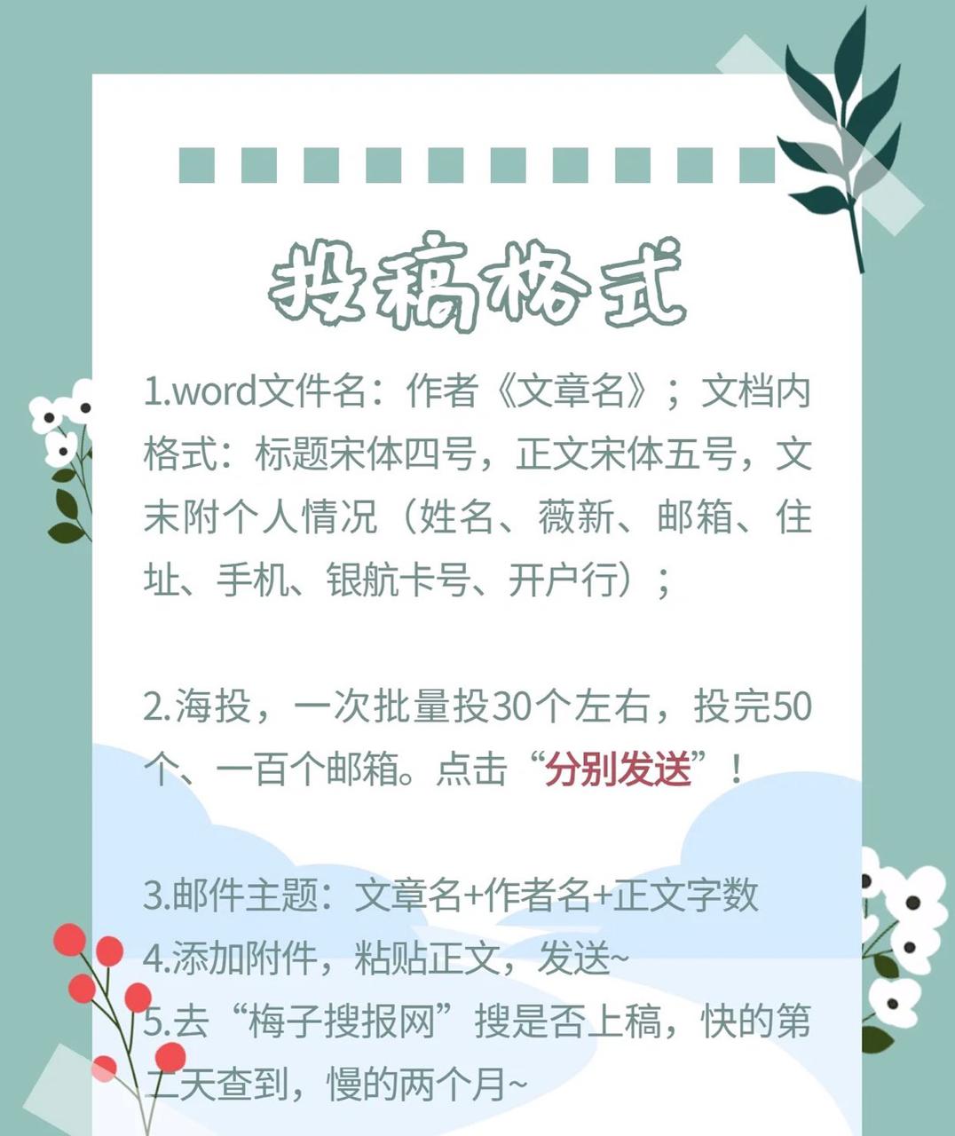 投稿格式:[栏目名称]标题+体裁+姓名+年龄。不要用附件投稿;没有作者信息的稿件,不予选用。