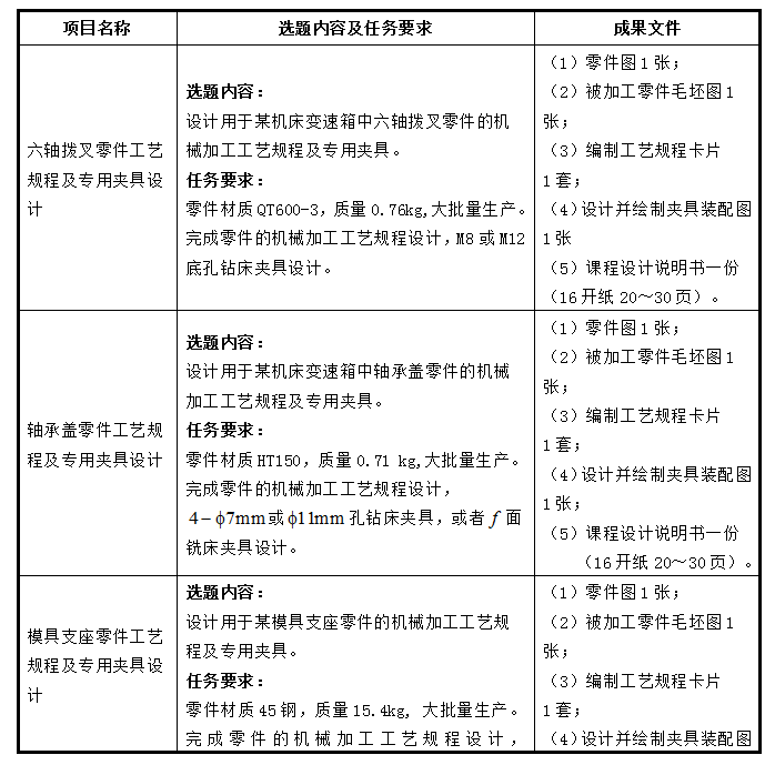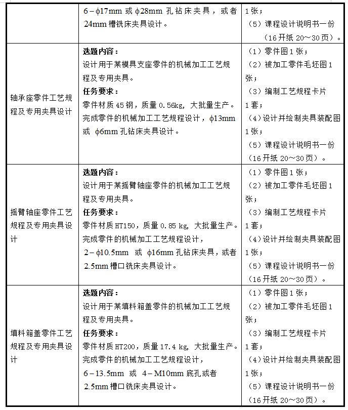 学生对指定的机器零件进行机械加工工艺设计。包括:绘制毛坯图、拟定机械加工工艺过程卡片、工序卡片、工装设计任务书等工艺文件,并设计手动专用机床夹具,完成夹具装配总图,零件图和课程设计说明书。