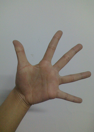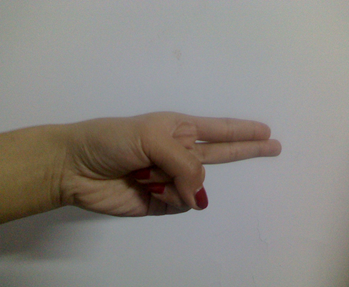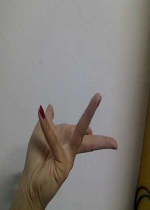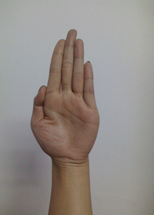 动作要领:无名指、小指半屈,拇指压在这两指上,中指与食指并拢伸直