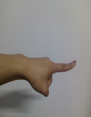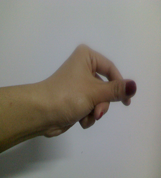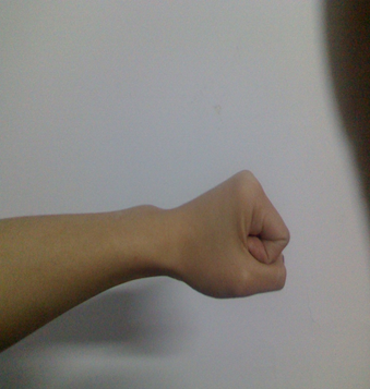 动作要领:四指屈,拇指第一关节扣压在食指与中指的第二关节处。