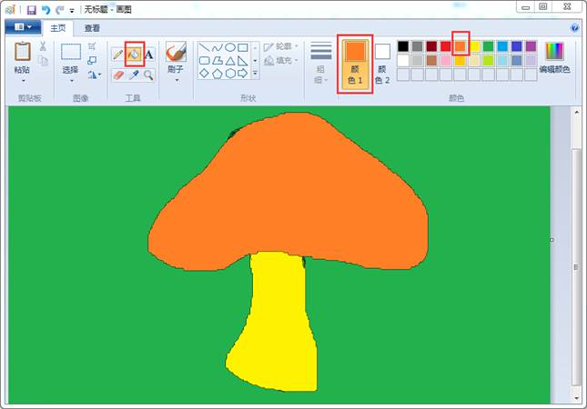 4.给小蘑菇上色。单击填充工具,前景色设为红色,单击蘑菇的伞盖,这时伞盖就变成红色了。用同样的方法把蘑菇的伞柄染成黄色。