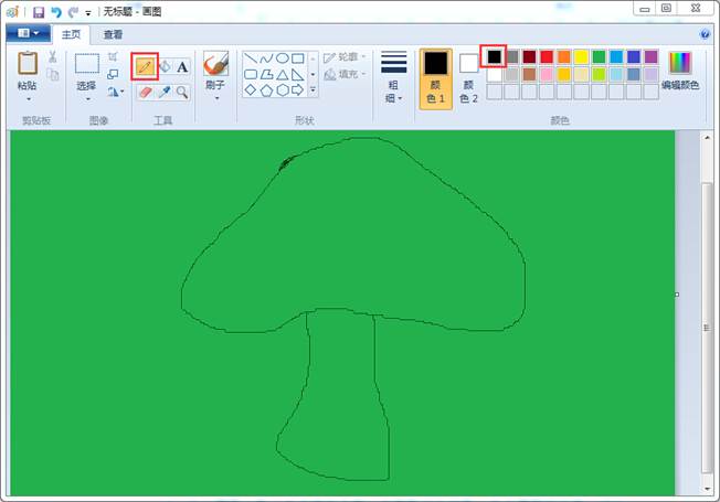 把鼠标指针移到画布上,这时鼠标指针变成笔,前景色设为黑色,拖动鼠标画出蘑菇的伞盖。用同样的方法画出蘑菇的伞柄。