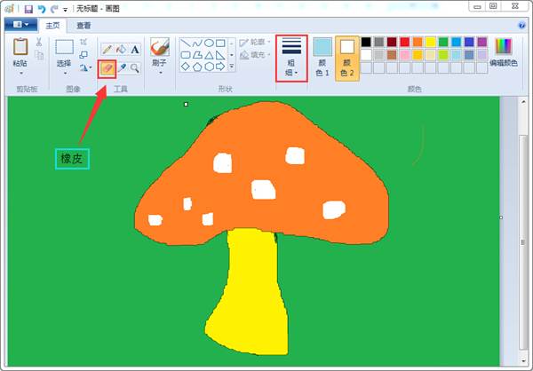 5,用橡皮工具"给蘑菇的伞盖加上漂亮的斑点。单击橡皮工具,选择橡皮的大小,在画布上拖动鼠标画出大小不一的蘑菇斑点。