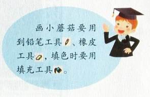 “采蘑菇的小姑娘,背着一个大竹筐……"丁丁哼着歌在魔力画室里翻着各种画图工具,心里想:“这些工具和我平时用的画图工具差不多,是不是很好用呢?画个小蘑菇见识一下画图工具的功能吧!"