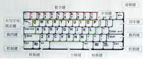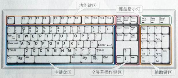 认识键盘:键盘一般有101个或104个键,按照功能分为4个区。