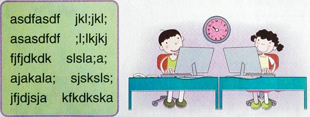 在“记事本"窗口进行基准键指法练习,同时注意空格键(可以使光标右移产生空格)和回车键(可以换行)的使用。将手指放在基准键位上,按下面的字母顺序进行指法练习。
