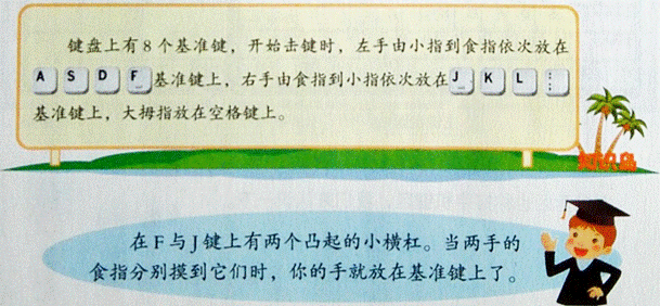 老师讲:键盘是计算机的重要输入设备,通过本活动,我们明确了键盘的各个分区,了解了每一个键的位置,知道了击键的方法和十指的分工,重点进行了8个基准键的指法练习。