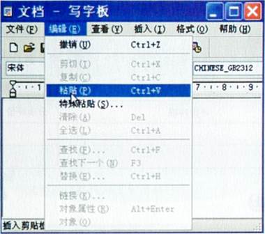 (2)粘贴文本。启动“写字板"程序,单击菜单栏中的“编辑"→“粘贴"(如图2一3一4),要被复制的文字就会出现在写字板的编辑窗口中。