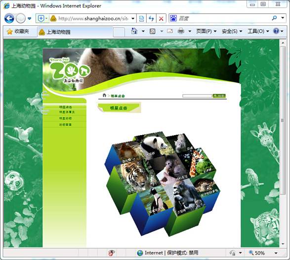 1.进入网站。在IE地址栏中输入www.shanghaizoo.cn,进入“上海动物园"网站主页。单击左边的“明星点击"栏目,进入该网页(如图2一3一1)。