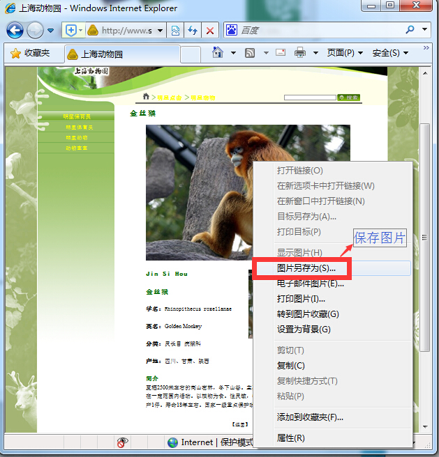 “上海动物园"网站中有一个“明星点击"栏目,丁丁想把可爱的金丝猴的图片和有关说明文本保存到自己的电脑里,他该怎么做呢?