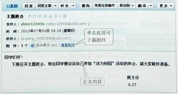 老师讲:收发电子邮件是信息时代必备的技能。发电子邮件时要注意正确填写收件人的电子邮件地址,否则收件人就无法收到你发的邮件。收到电子邮件时,可以根据主题了解邮件内容,同时邮件如果带有附件,要学会下载。