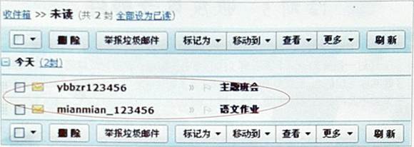 3.查看未读邮件。在图2一5一2中,单击“未读邮件"后面的“收件箱2 封"字样,打开未读邮件夹(如图2一5一3),其中有2封未读邮件,一封的主题是“主题班会",发件人是“ ybbzr123456 ",另一封的主题是“语文作业",发件人是“ mianmian_123456 " 。