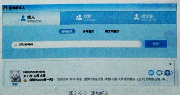 4,添加好友。新号码首次登录时,好友名单是空的,要和其他人联系,必须先要添加好友。单击主面板底部的“查找"按钮,在打开的对话框中输入好友玲玲的QQ账号,单击“查找"按钮(如图2一6一5)。这时玲玲的信息显示在下面,单击添加好友按钮“