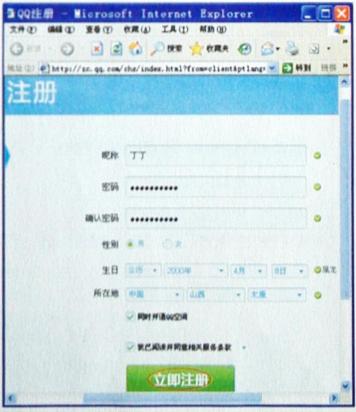2.申请QQ号。单击界面右边的“注册账号",进入QQ 注册页面(如图2一6一3),按照页面中的提示,逐一填写“昵称"、“密码"、“确认密码" 等项目,然后单击“立即注册"按钮。这时会出现申请成功页面,并显示所申请的 QQ号。