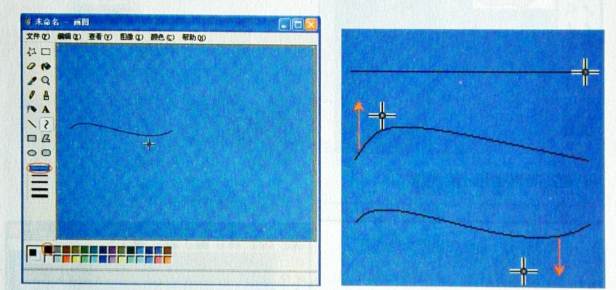 3.画海洋中的波浪。单击曲线工具2,选择第一种线宽,用黑色作前景色(如图3一7一3)。拖动鼠标,先画出一条直线,接下来单击曲线一个弧的位置,然后拖动鼠标调整曲线形状。再单击曲线第二个弧的位置,拖动鼠标调整曲线形状(如图3一7一4)。
