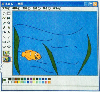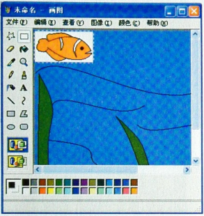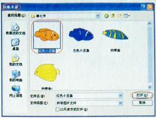 5、把漂亮的小鱼放到“海洋”中。如图3-7-6所示,单击“编辑”→“粘贴来源”,在“粘贴来源”对话框中,打开教材光盘中名为“红色小丑鱼”的图片,单击“打开”按钮。这时小于已放在画布上了(如图3—7—7)。