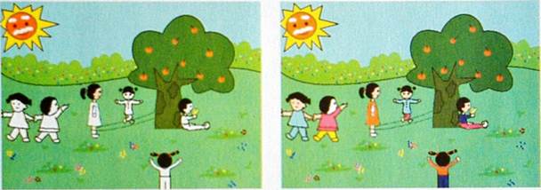 由于时间仓促,丁丁的作品(快乐的童年》没有画完(如图3一8一1),请你帮他把画面中小朋友的皮肤和他们穿的衣服填上颜色,把他们打扮得漂漂亮亮的。可参照图3一8一2去做。