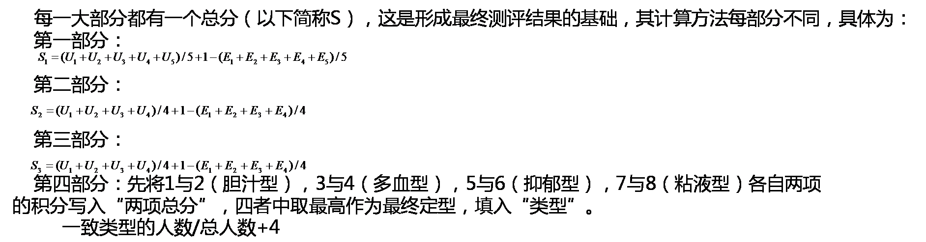 每一大部分都有一个总分(以下简称S),这是形成最终测评结果的基础,其计算方法每部分不同,具体为: