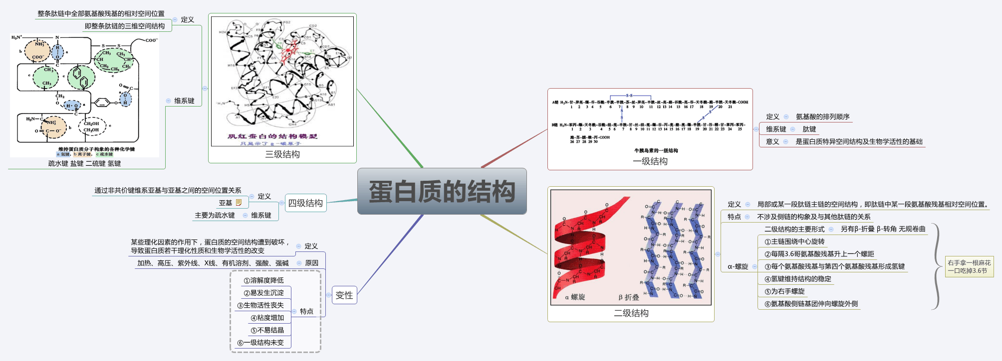 | 蛋白质结构 | 定义 | 基本单位 | 维持稳定主要化学键 | 备注 |