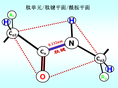 a)肽单元(peptide unit):肽键中的四个原子(-CO-NH-)和与之相邻的两个α碳原子(Cα1、 Cα2)位于同一刚性平面内,称为肽单元。是蛋白质二级结构的基本单位。
