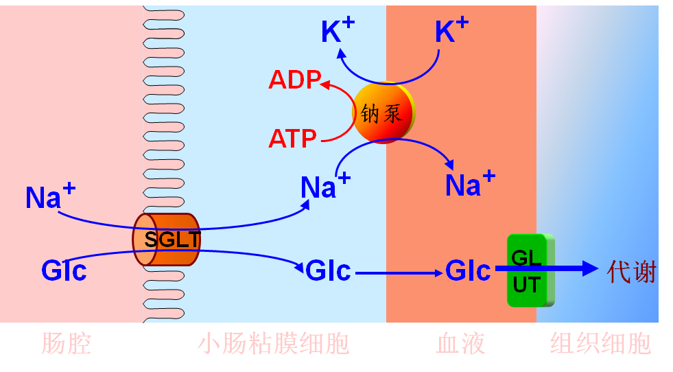 小肠粘膜上皮细胞对葡萄糖的吸收是逆浓度梯度的主动转运(active transport)。